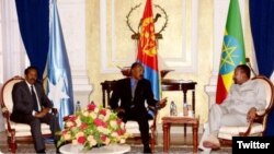 ፕ/ኢሳይያስ ኣፈወርቂ፡ቀ/ሚንስተር ኢትዮጵያን ፕረዚደንት ሶማልን ሎሚ 27 ጥሪ፡ኣብ ኣስመራ ቤተ-መንግስቲ ተራኺቦም ስሉሳዊ ርክብ ድሕሪ ምክያዶም ሓባራዊ መግለጺ ኣውጺኦም።እቶም መራሕቲ ኣብ ምምዕባል ስሉሳዊ ዝምድናታት፡ገስጋስ ኣቐዲሞም ናይ ዝተበጽሑ ስምምዓት ከምኡ’ውን ንሰለስቲኦም ሃገራት ሓባራዊ ኣገዳስነት ኣብ ዘለዎም ጉዳያት ድሕሪ ምዝታዮም’ዮም ሓባራዊ መግለጺ ኣውጺኦም።