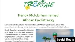 ወዲ 24 ዓመት ኤርትራዊ ፕሮፈሸናል ተቐዳዳሚ ብሽክለታ ሄኖክ ምሉእብርሃን፡ ንወዲ-ሃገሩ ቢንያም ግርማይ ቀዲሙ፡ ናይዛ እትዛዘም ዘላ ዓመት ዝበለጸ ኣፍሪቃዊ ተቐዳዳሚ ኣህጉር ኣፍሪቃ ተሰይሙ ኣሎ። ንዝመጽእ ክልተ ዓመታት ምስ ጋንታ ኣስታና ቃዝቃዝታን ፈሪሙ ዘሎ ሄኖክ፡ ኣቐዲሙ ምስ በበይነን ዓበይቲ ጋንታታት ከም ባይክ-ኣይድን ግሪን ፕሮጀክትን ተሓቚፉ ተወዳዲሩ’ዩ።